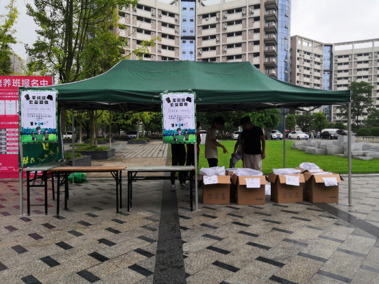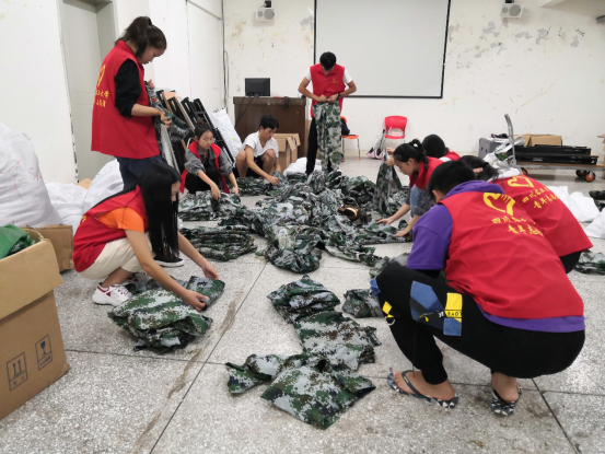 活动前期,部分志愿者在小广场设点收集军训服,部分志愿者在各个寝室楼下值班收集军训服。 军训服回收完后,志愿者们一起将鞋子、雨衣、套装、皮带、腰带分类装袋。活动后期,志愿者们将各类用品进行义卖,筹得一笔善款捐给了偏远地区的孩子们。