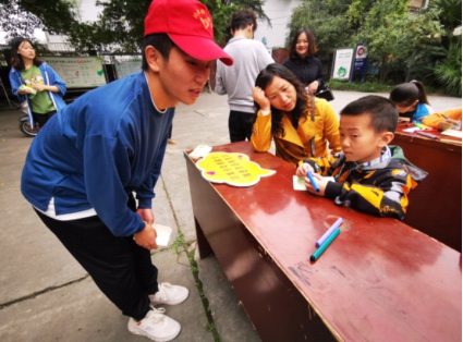 10月19日早上8点半,动科青工的志愿者们经过长达15分钟的车程,依次到达目的地——金马镇青年之家。到达工作岗位后,志愿者们紧锣密鼓地开始布置场地。早上九点半,垃圾分类主题活动正式展开。当进行到热闹的环保趣味小游戏时,志愿者将在场的十个家庭分为两组,以接力赛形式让小朋友将写着各种垃圾名称的小卡片投入相应的家长手中的垃圾分类口袋里。小朋友们争先恐后,抢着把手里的小卡片投入口袋,每个参与者的脸上都流露出紧张而又欢乐的神情。场上年龄最小的一名四岁小女孩,一股脑儿地把手里所有的卡片全部塞到了拿着有害垃圾口袋的爸爸手里,惹得场上爆发出阵阵欢笑。最后的阶段是绘制环保宣言卡片。小朋友们手执画笔,认认真真地在卡片上写下自己的环保口号,画出对美好地球的无限畅想。小朋友们也积极举手,拿着自己的卡片上台展示,快乐而又自信地向在场观众讲述他的卡片内容,精彩生动的讲解赢得了在场所有人热烈的掌声。