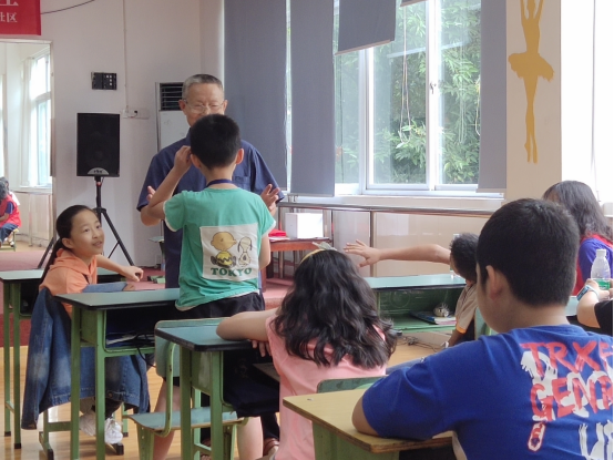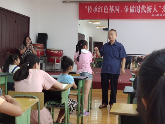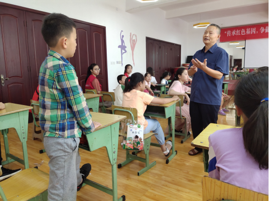主讲人黎炳代同志已经70多岁了,他既是一位老校长,也是老专家、老党员、老战士、老模范。在上课前,来自动科青工的志愿者鲍兴利与黎老先生进行了一个短暂的交流,其中黎老谈到:“这些来的孩子们年龄跨度较大,大多都是7至8岁的孩子,如果直接从深奥的爱国道理来入手讲解,他们肯定是听不懂的。所以得先从简单有趣的话题切入,把他们的兴趣提上来了之后再进行讲解。”