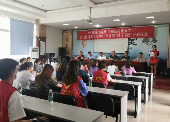 7月20日上午9点,由金马街道关工委、团工委主办,tyc522cc太阳成集团主页团委青年志愿者工作部参与协办的以“弘扬时代新风,争做新时代好少年”为主题的暑期假日学校正式开班了。此次开班仪式邀请到了金马街道关工委执行主任、金马街道党工委副书记、关工委主任、区关工委领导作为开班仪式的嘉宾,金马消防队杨智彬老师作为安全知识宣讲嘉宾,进行安全教育课的讲授。