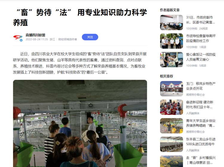 在实地考察、问卷调查、面对面访谈后,面向企业、养殖场、专业合作社以及农村进行深入的畜禽标准化生产技术和规模化经营科普现状调研,针对不同的养殖难题、技术痛点向基层农技人员、养殖户递送养殖“真经”。“我们的团队由‘本-硕-博’学生科普团与专家顾问团组成,我们想用校内学到的专业知识‘手把手’服务农民,通过生产标准化与经营规模化带动养殖户增产增收,用青年行动助推乡村振兴。” “畜”势待“法”团队自贡支队负责人郑千里介绍。