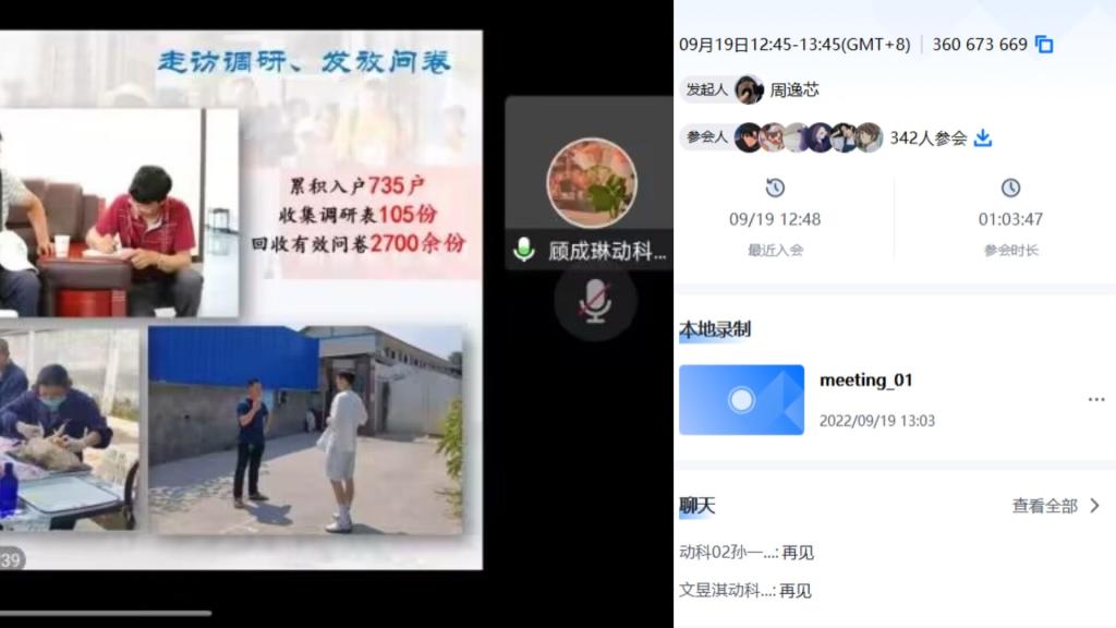 会上,学院团委实践部曹翔宇同学首先对我院此次暑期社会实践的总体开展情况和实践成果进行了总结汇报。随后,由入选雷波专项服务团、获评校十佳团队的《“畜”势待“法”—畜禽标准化生产及规模化经营科普先锋》负责人顾成琳和《向阳花·渔樵耕读》团队的董芮伶同学分别就如何将专业所学、三农情怀培养、乡村振兴助力融于社会实践全过程进行了分享。之后,学院团委实践部周逸芯同学展示并详细解说了本次社会实践的优秀图文,开展了社会实践“微云展览”。最后,学院团委李老师和实践部同学进行了集中答疑。