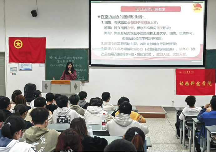 接着由学院团委办公室负责人夏星灿为大家讲解青年大学习学习要求及规范,并对动科院官Q投稿要求和二课活动的相关事宜进行讲述;团委学生融媒体中心负责人李雪杨为各团干讲解小班自媒体账号管理及学院各新媒体平台投稿要求,以及学院宣传工作提示。