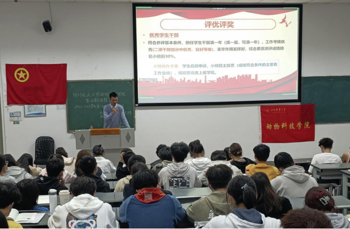 随后由学院学生会综合办公室负责人曹星宇同学详细介绍了班长具体职能以及家庭经济困难学生认定的工作程序和注意事项,各荣誉称号、奖学金、单项奖的具体内容与评选条件等。