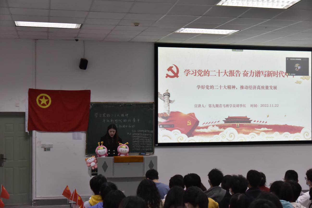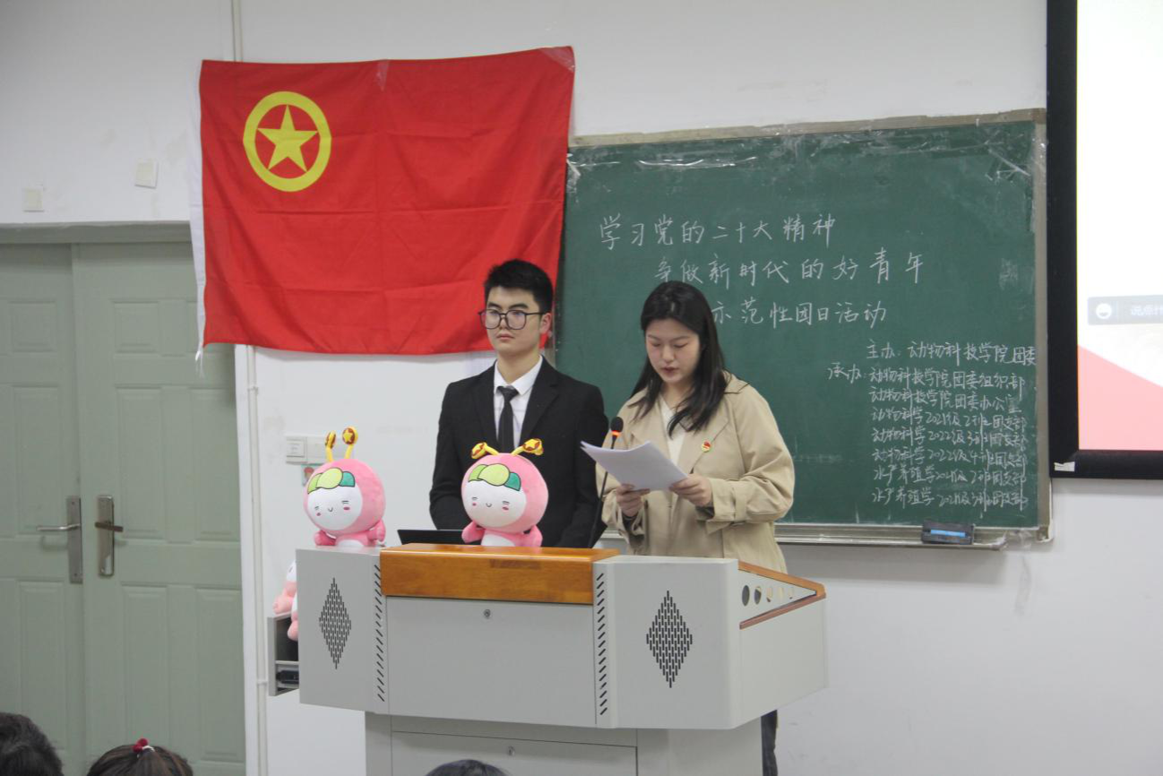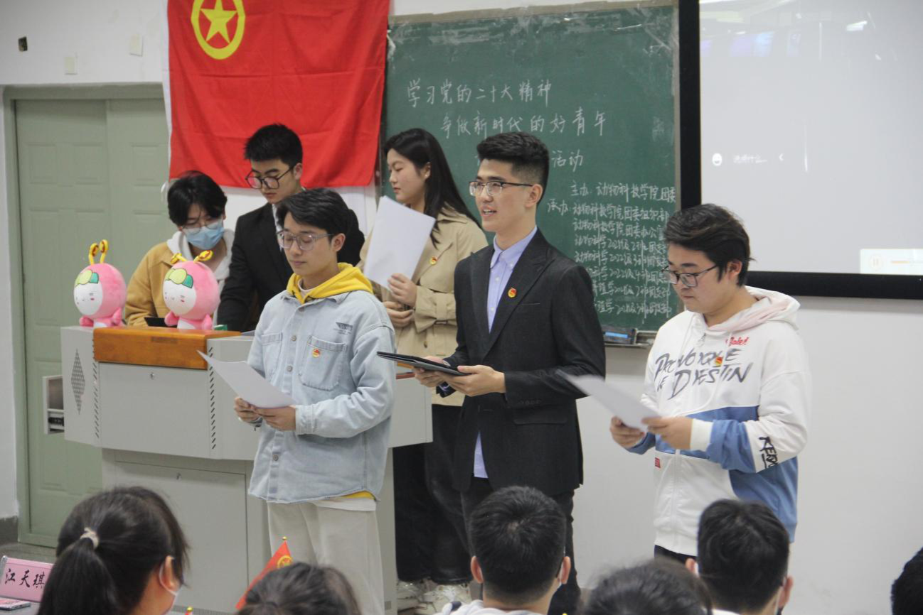 热学热议党的二十大,奋楫笃行开启新篇章。活动伊始,由学院团委书记韩庆龙老师带来“党的二十大精神学习专题”微团课,而后通过学校第九期青马班学员、学院团委学生兼职副书记胡季红同学的“学好党的二十大精神,推动经济高质量发展”主题宣讲以及“看图猜名学模范”竞答小游戏等环节,与会青年们对党的二十大代表的印象更加深刻,对党的二十大精神内涵的理解更加深入。由动物科学202204团支部成员自制的《十年风雨,不负所望》微视频,结合动物科学专业特色,带领同学们回顾了新时代十年来养殖场的伟大变革,同学们在观看之后纷纷感叹:“见微知著,从平地散养猪到楼房式数智化养猪,仅仅通过我国养猪场这十年的巨大变化,已然能充分感受到在中国共产党的领导下,中国经济高速发展、科技能力飞速提升。”