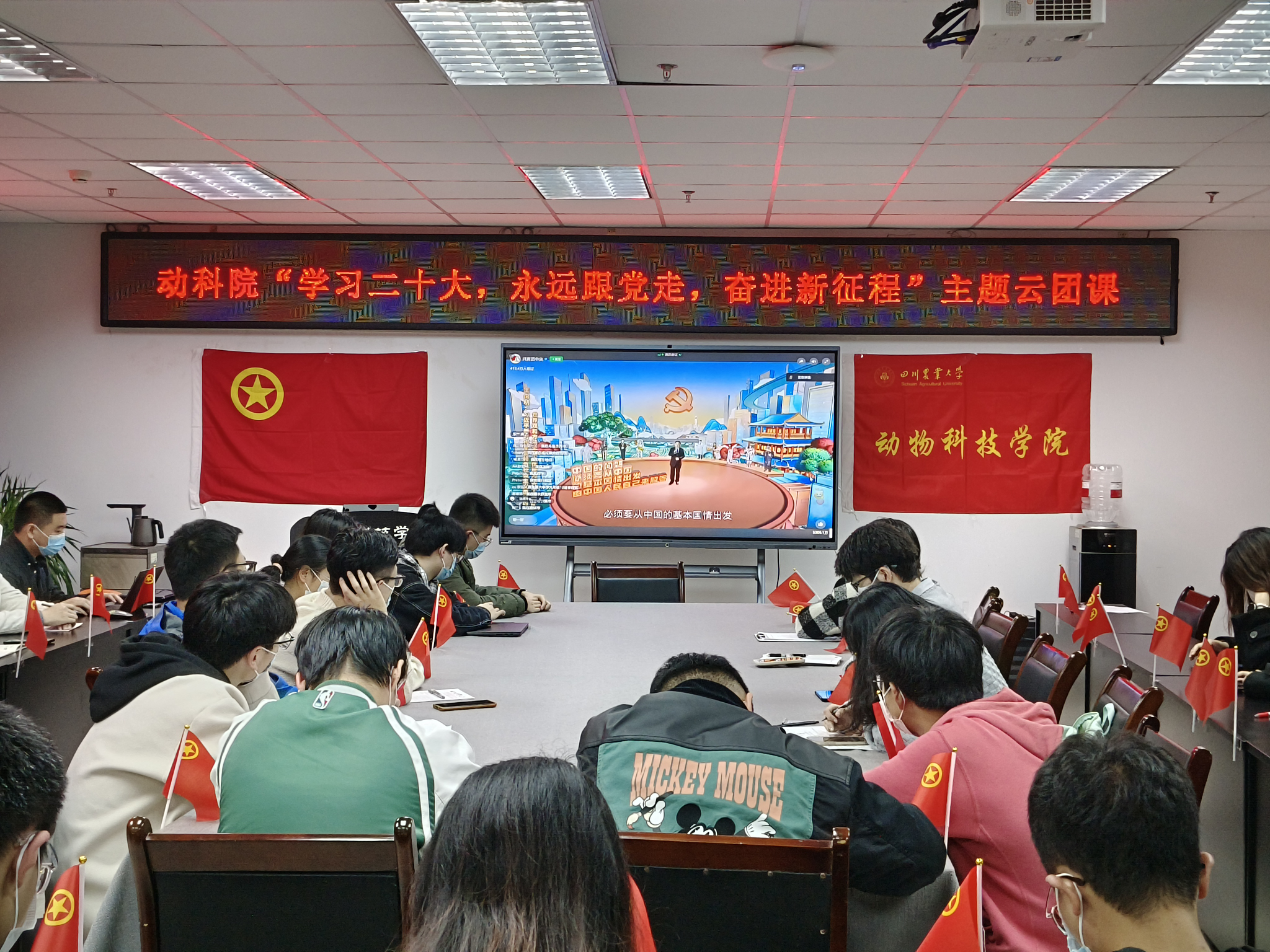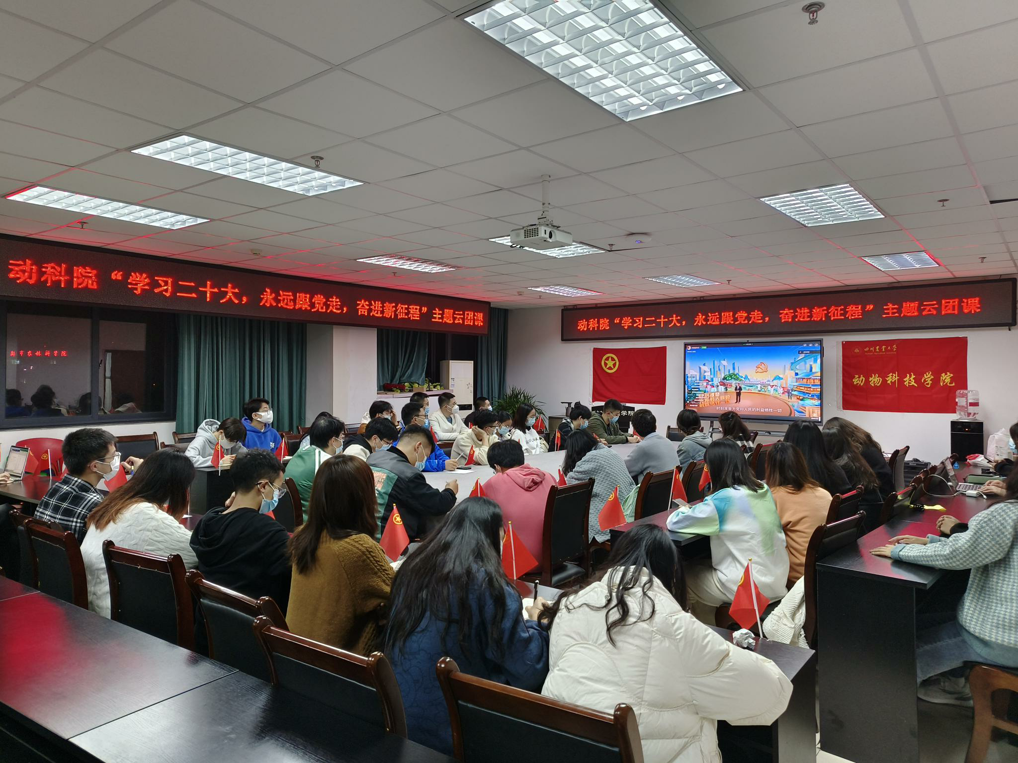 11月26日晚19:00,学院第五期青马班学员,全体团干部、团员通过线上线下结合的方式完成了“学习二十大,永远跟党走,奋进新征程”主题云团课学习。结合疫情防控政策要求,学院第五期青马班同学和本科生代表分别在七教1011和4B205线下集中观看团课直播,其他同学在寝室、教室、实验室等分散参与线上学习。
