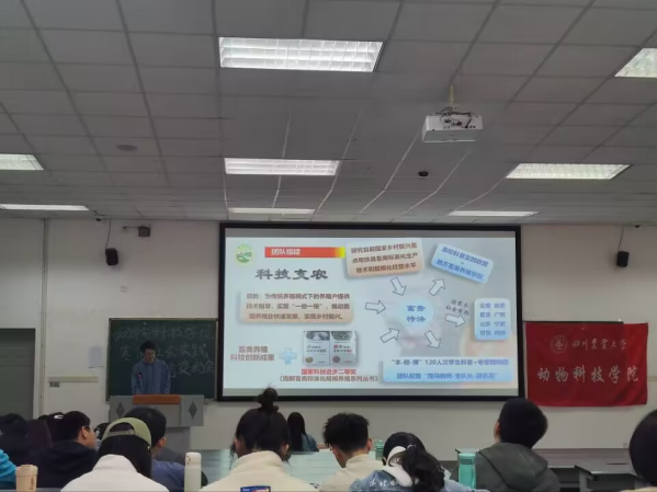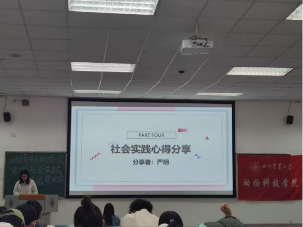 活动伊始,学院团委实践部负责人详细介绍了2023年寒假社会实践的开展概况,全院共700余名同学以团队(个人)形式围绕“学习党的二十大精神,实践当先锋,奋进新征程”主题,开展了红色足迹寻访、畜牧产业调研、环保知识普及、科研项目创新、志愿公益活动等青春建功实践行动。接着,“寻陌·赓溯”团队和“‘畜’势待‘法’”两个优秀团队成员陈茜和郑千里同学分别上台做分享,他们结合视频、图文,就“如何组建团队”、“怎样创新项目”、“何以提升实践成效”等方面作了详细阐释,引导同学们知实践、懂实践、作贡献、长才干。