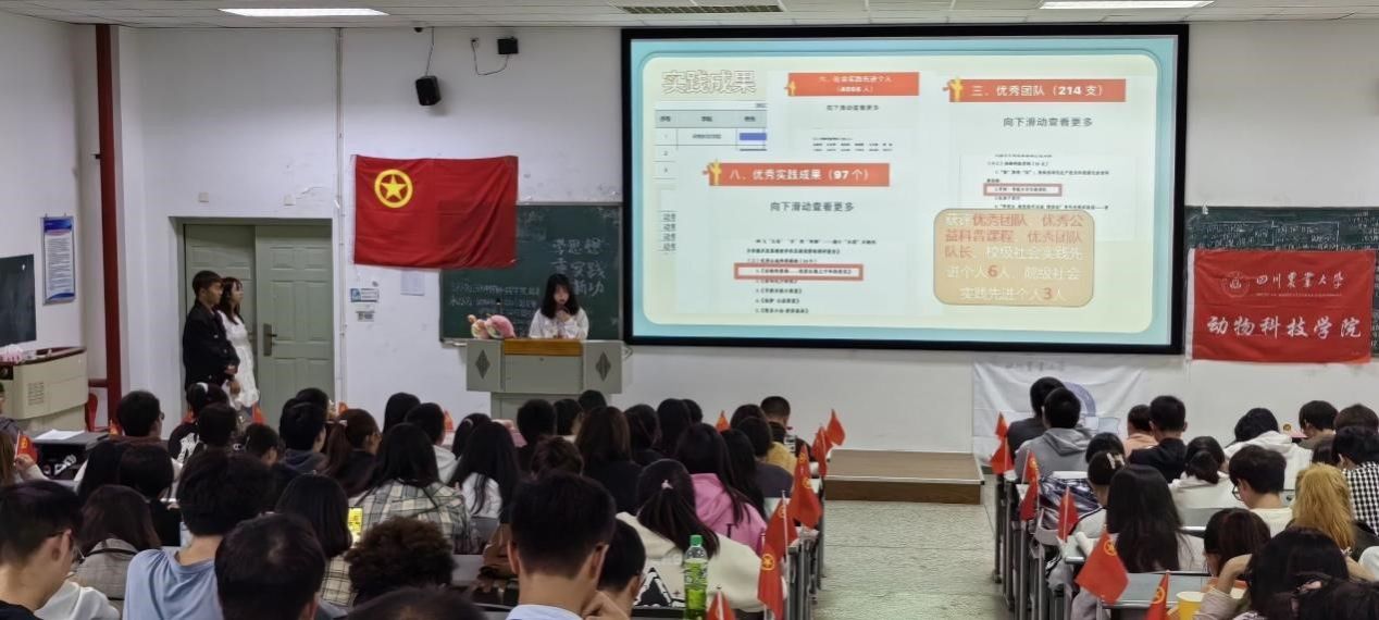 为深入开展学习贯彻习近平新时代中国特色社会主义思想主题教育,加强对广大团员和青年的政治引领,不断铸牢对党忠诚、坚定理想信念、发扬斗争精神、勇于挺膺担当的目标任务。tyc522cc太阳成集团主页团委直属部门流动团支部、动物科学202201团支部、动物科学202203团支部、动物科学202205团支部、动物科学202305团支部、水产养殖学202302团支部于10月25日在4-A206联合开展“学思想 重实践 建新功”示范性班团活动。本次示范性班团活动通过忆往昔峥嵘岁月、看今朝潮起潮落、望未来任重道远三大篇章展开,共计180余名师生到场参与。