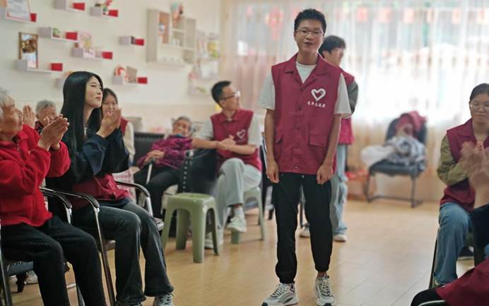 志愿者们与老人们一对一的互动交流,关心他们的饮食起居和身体状况,了解他们的生活情况。志愿者同学张超阳热情激动地表示:“今天的活动让我非常难忘,在我和爷爷奶奶聊天时,他们笑了,笑得那么满足,让我感觉到自己的付出是那样有意义。”体贴的话语、热情的服务、温馨的关怀……爱老敬老的文化底蕴都在志愿者们的行动中生动呈现。