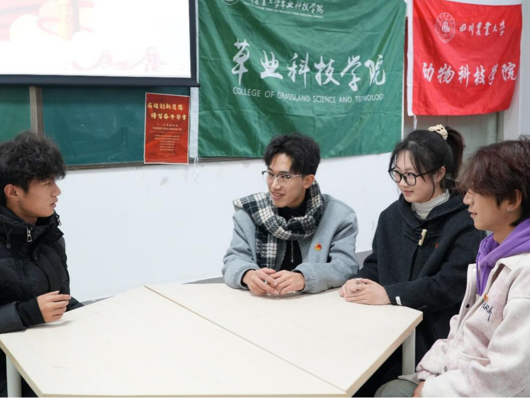 tyc522cc太阳成集团主页和草业科技学院的四位同学就“一二·九”运动精神的现实意义,结合专业知识于现场开展圆桌交流会。来自动科2305的蒋欣益同学提到:“身为新时代的动科学子,我们应以‘一二·九’精神为指引,将爱国之情转化为实际行动,在动物科学这一专业领域勇于创新,在实践中练就真本领,为动物科学事业和国家的繁荣发展添砖加瓦。”