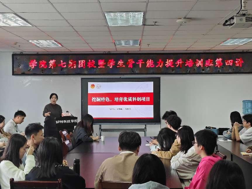 校团委办公室二室主任马骢毓以“挖掘特色,培育优质科创项目”为题,以“挑战杯、中国国际大学生创新比赛、创青春”三大赛事为载体,通过实际案例分析,对比赛环节进行层层剖析,并详细阐述了参赛及获奖的运行逻辑。
