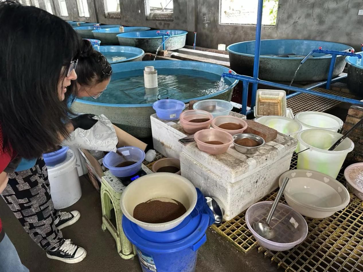 天全县川泽渔业有限公司工作人员向“链动鲟势·渔兴创研”团队分享饵料配比经验