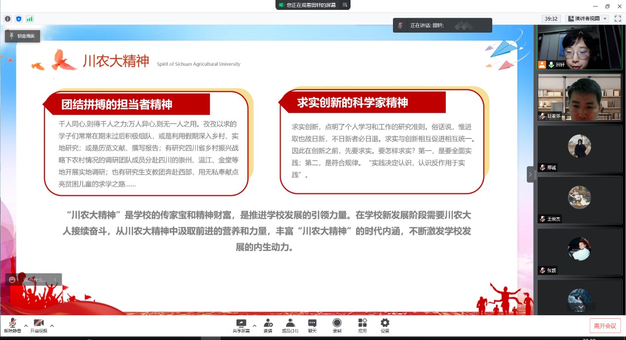 此次班会重点便是带领同学们,特别是22级新生在入校之前便深入学习并了解“川农大精神”,从爱国敬业的逆行者精神,到艰苦奋斗的追梦人精神,到团结拼搏的担当者精神,再到求实创新的科学家精神,每一个精神背后都是一个个川农人的故事,激励鼓舞着一代又一代人艰苦奋斗,敢于创新,追逐梦想。同学们纷纷表示,在班会中感受到了作为一名川农学子的担当,体会到在新时代推进学校实现高质量发展、建设特色鲜明的一流农业大学建设目标的大环境下,应接续奋斗,把“川农大精神”转化为日用而不觉的精神力量和行为习惯,做新时代“川农大精神”的践行者、弘扬者,以一往无前的奋斗姿态和永不懈怠的精神状态成就非凡业绩,不断为学校事业发展凝聚思想共识与精神力量,不断开创学校事业发展新局面。