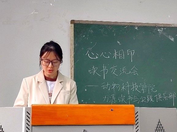 8名同学分别分享了不同种类的书籍,讲述自己关于书籍的见解和感悟,并积极与同学们交流,动科202003班柴茂月同学用书籍《浮生六记》的一句话表达了她的学习生活态度:“人间有味是清欢”。