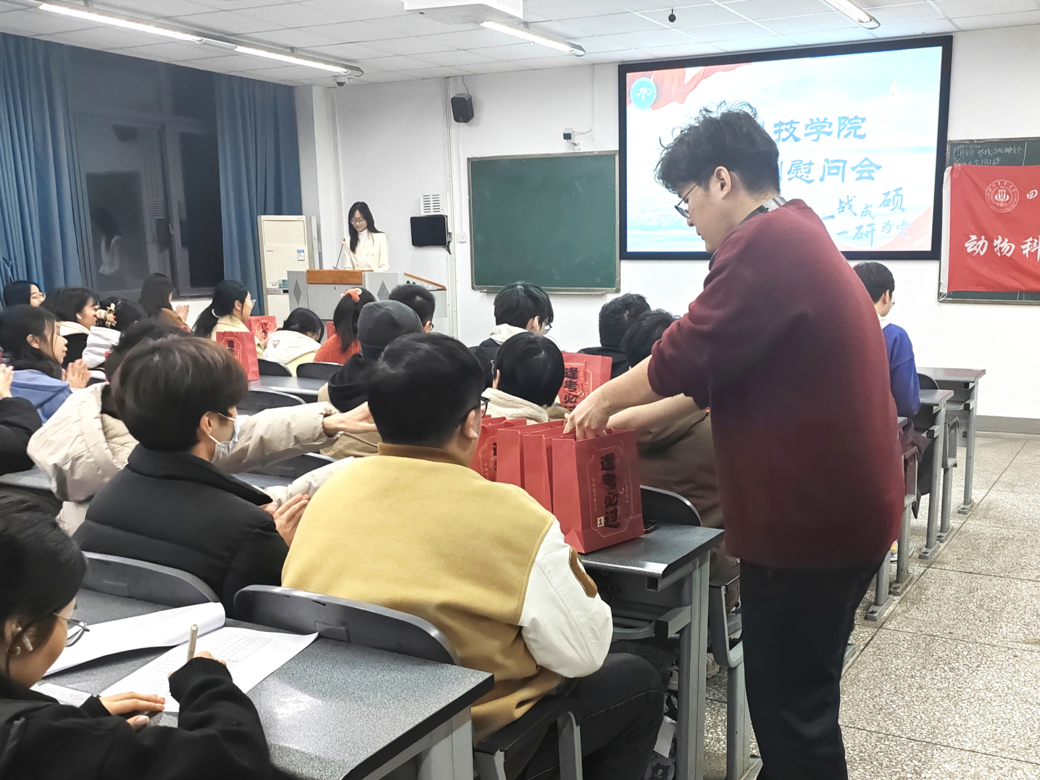 活动分为三个环节:首先,杨雪书记发表考研寄语,分享宝贵经验,为学子指明方向;其次,老师们向学生赠送温暖礼包,以示支持与鼓励;最后,师生合影,记录这一温馨时刻。