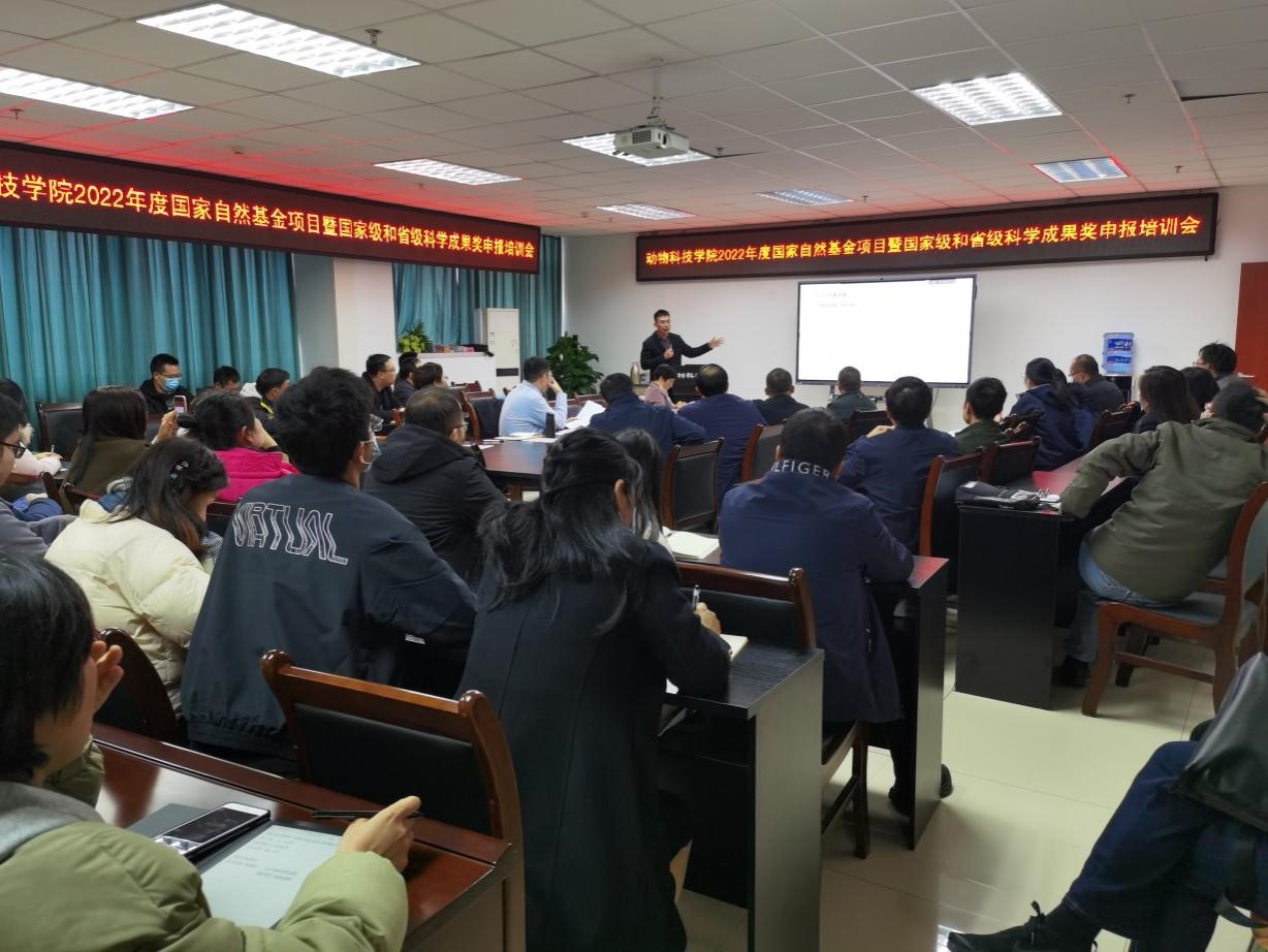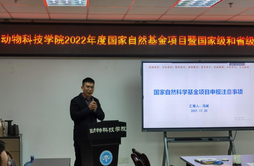11月25日下午,学院2022年度国家自然科学基金项目暨国家级和省级科技成果奖申报启动培训会在7教1012会议室召开。特邀学校科技处副处长刘杨、动物营养所冯斌教授与会指导。院长朱砺,党委书记付瑞琼,副院长王继文、赵小玲以及学院全体教职工参加会议。会议由副院长赵小玲主持。
