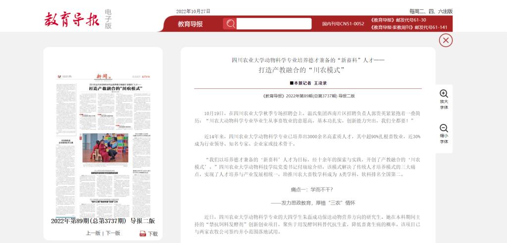“我们以培养德才兼备的‘新畜科’人才为目标,经十余年的探索与实践,开创了产教融合的‘川农模式’。”tyc522cc太阳成集团主页党委书记付瑞琼介绍,该模式解决了传统人才培养模式的三大痛点,实现了人才培养与产业发展相统一,助推川农大畜牧学科成为A类学科,软科排名全国第二。