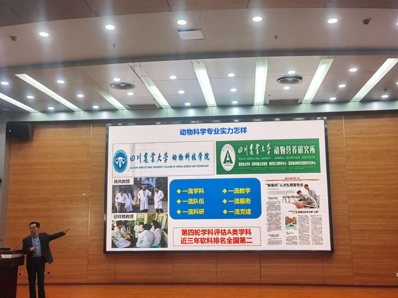 10月25日下午,动科学院特邀国家级教学名师、原副校长陈代文教授,国家杰出青年科学基金获得者、国家优秀青年科学基金获得者、学校副校长李明洲教授,在成都校区二教报告厅开展动物科学专业新生专业教育。学院党委书记付瑞琼、副院长赵小玲、专业教师、班主任及全体动科专业新生聆听了讲座。